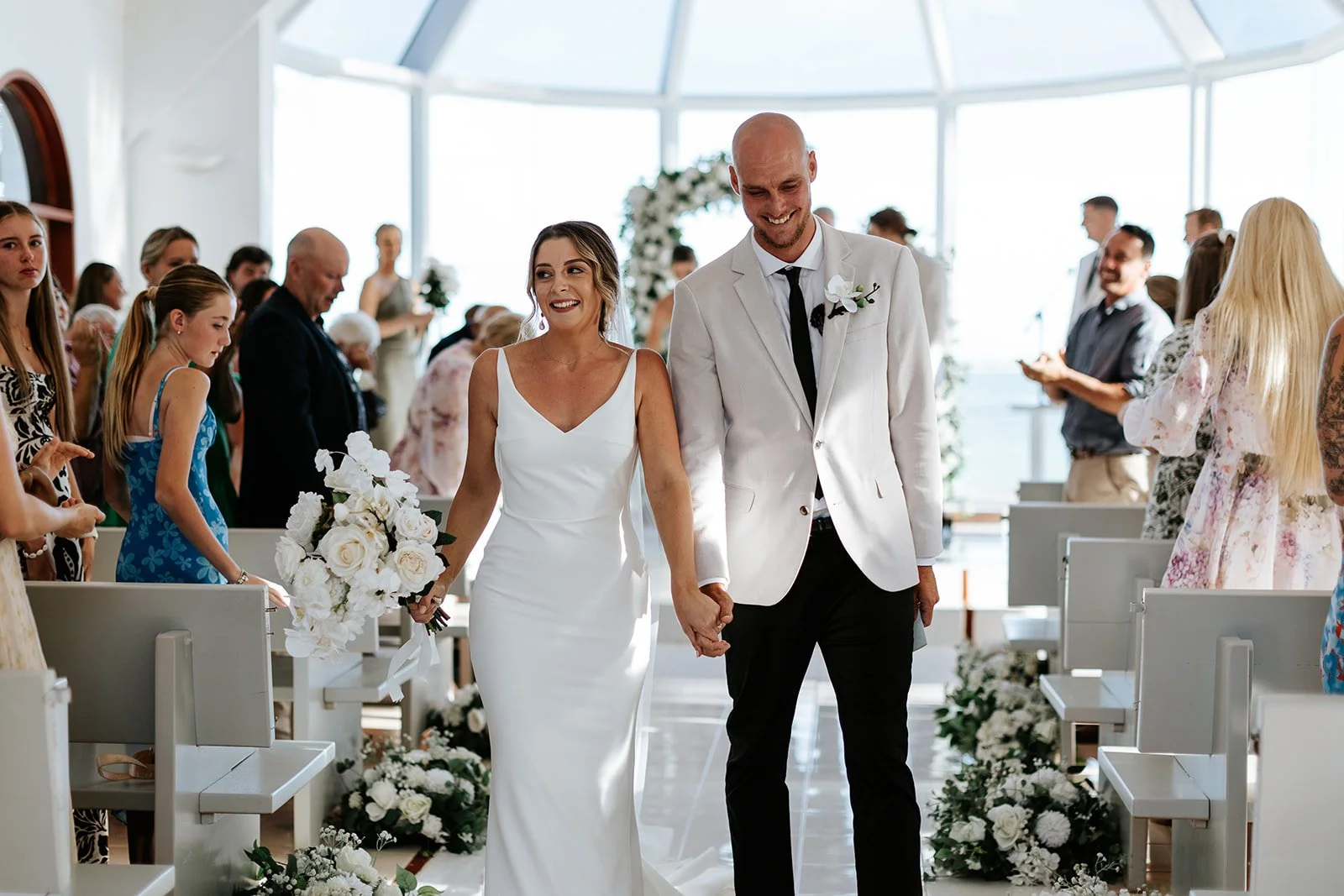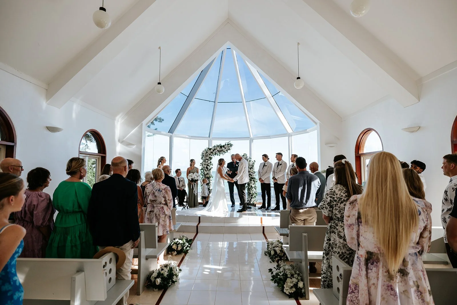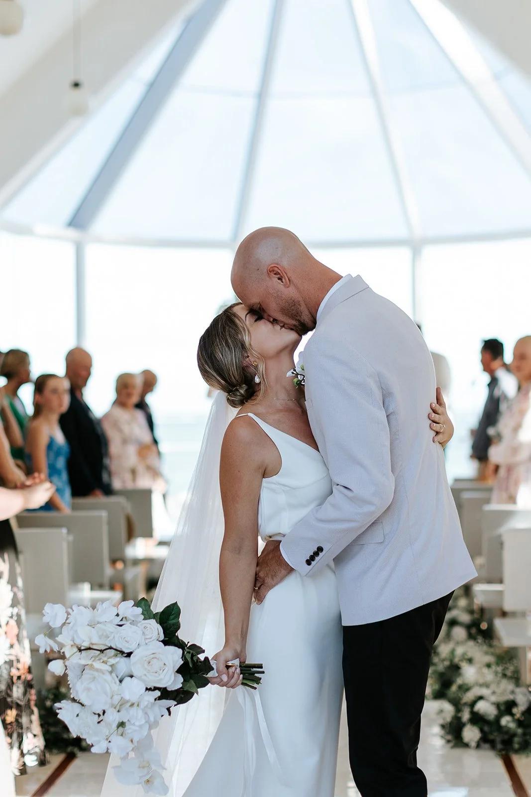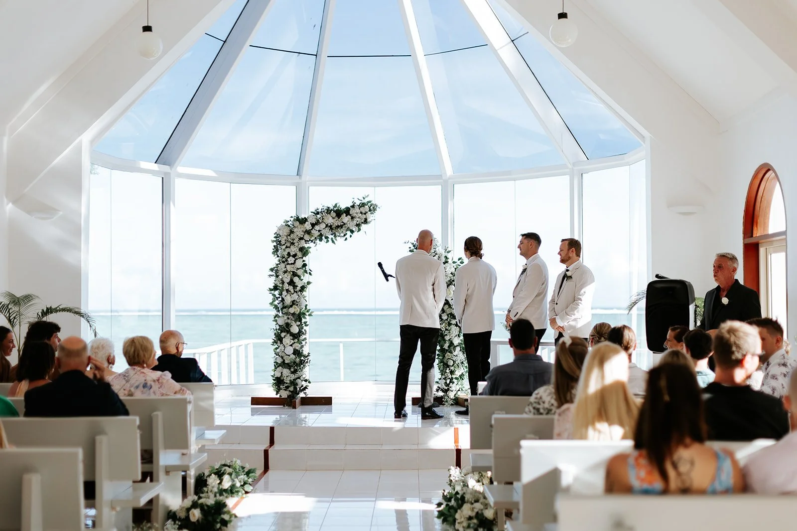 They married in the Seaside Wedding Chapel - a light-filled, glass-fronted chapel overlooking the ocean, surrounded by the people who matter most. The ceremony was full of happy tears, big smiles and so much love, followed by golden-hour portraits along the shoreline and gardens. Then came the big party: laughter, hugs, and a packed dance floor that went late into the night.